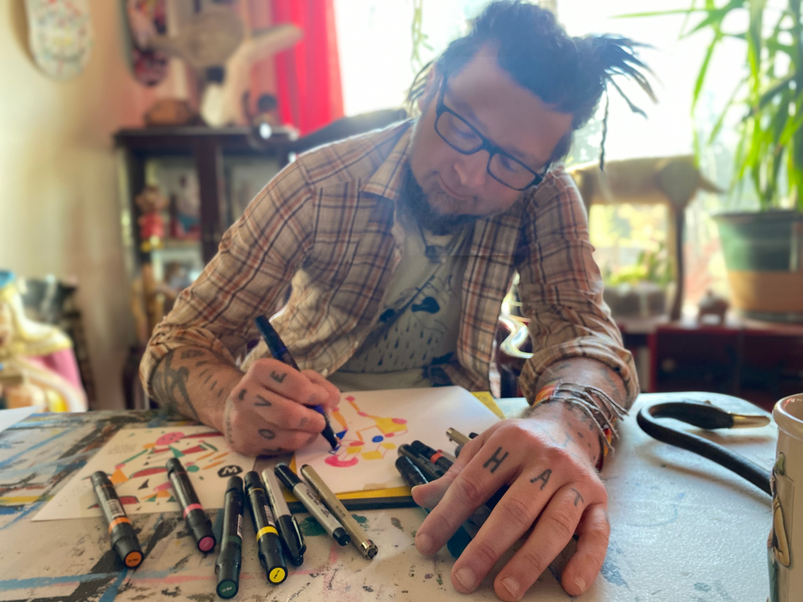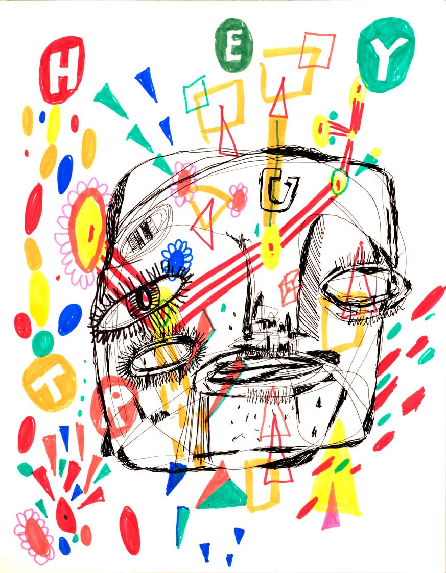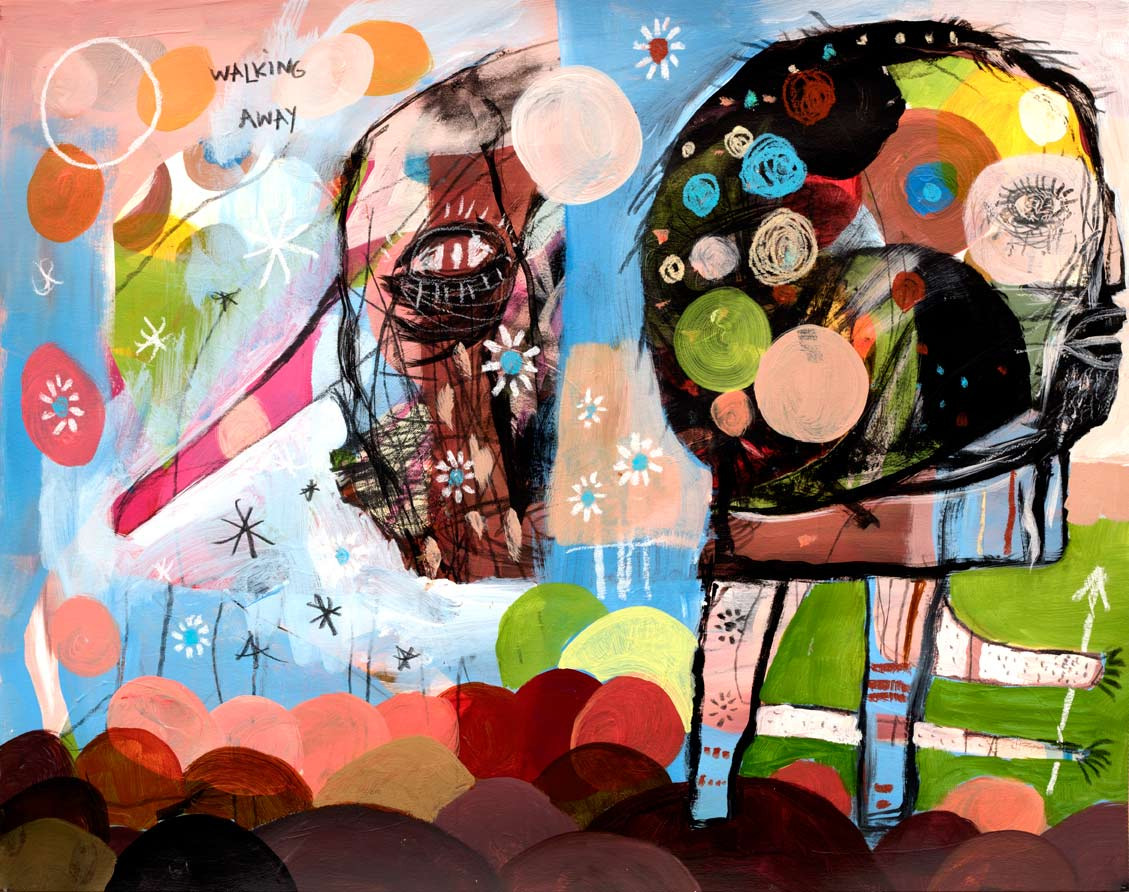 The grab is one of the most powerful moves at the base of my techniques. Its a very backward move from what many people are used to, painting around a shape you want to create rather than painting in the shape. This is what gives the collage look. It allows you to capture expression you have already created by grabbing shapes and allowing things to be forced together. This tends to encourage random and raw capture, oppose making a plan and executing a composition or form. In this case although the plan seems clear we are far more likely to end up with harder questions color choices, the question of is this right or worthy. In contrast to the grab where it seems as though things appear. It also keeps us focused on color, size elements, variation, contrast and base shapes rather than details that can convince us to overlook these more predominant elements of our work. The details are the least important bits, we want to give them the last of our attention. To keep our ideas movements and choices free and experimental.