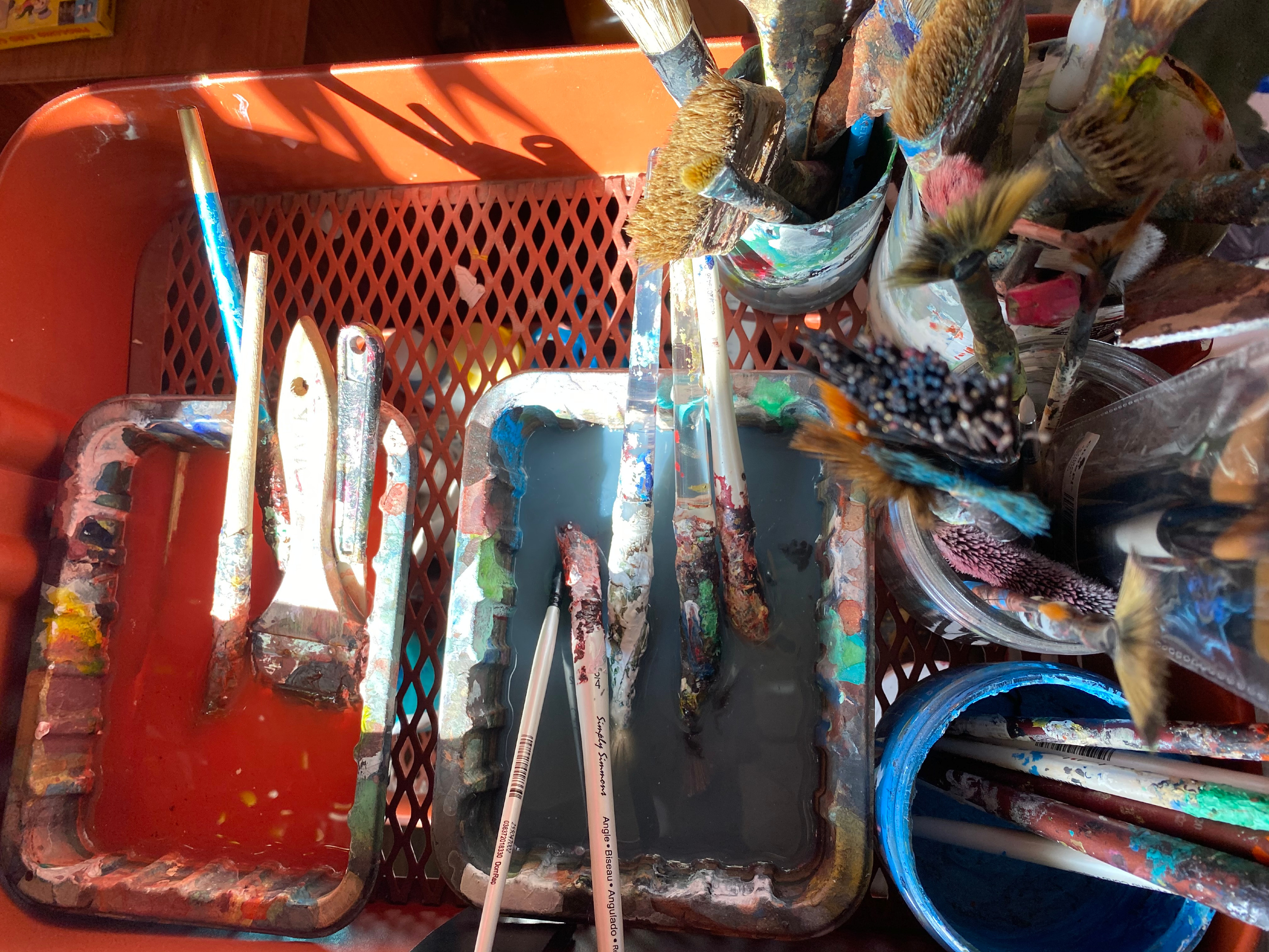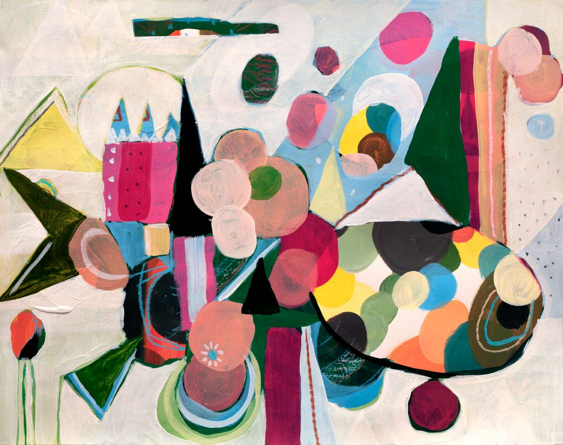 Grabbing is used to focus us in on an area we like, an area of variation we think will look good together. It separates the grabbed area from the rest of the painting. We paint around areas we like to reveal them and make them clear to see by painting out what is around them. The grab is fast and powerful as it recomposes the entire piece, creates a composition within the grab of colors, sizes elements and space, adjusts the palette by the use of a large amount of flat blocking color. Grabbing removes activity to make room for new activity, as well as creates shapes within the grabs.